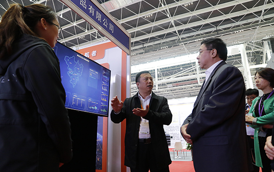 ▲河北新发地农副产品有限公司总裁魏树俭为保定市长郭建英介绍农业大数据
